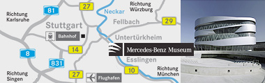 Approaching on the A81 motorway from Heilbronn: Take the "Zuffenhausen" exit; from here onto the B10 in the direction of "Stuttgart-Zentrum", then follow the traffic management system signs towards "Gottlieb-Daimler-Stadion / Mercedes‑Benz Museum".